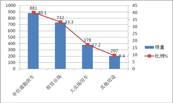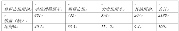 特点一、销量比例占据全国市场11%的份额;单位通勤车接近40%,比例最高;其次租赁市场用车,再次市场卖场用车