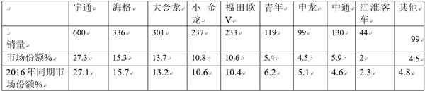 4、海格、青年、申龙、江淮客车份额等同比下降。