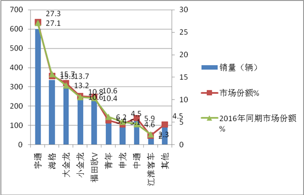 2、“三龙”品牌也不示弱,其中海格份额最大,其次是大金龙,再次是小金龙。“一通三龙”等一线品牌在京津地区的市场份额累计占据了67.1%,比2016年同期上升了近0.5个百分点,说明一线品牌集中度在加强。