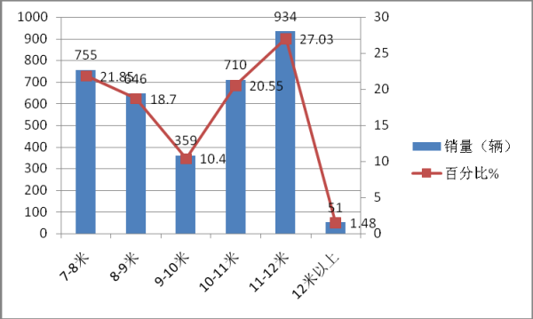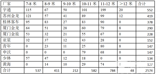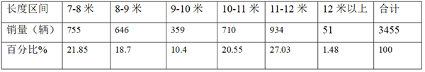从上表可以看出: 广西市场,11-12米是主打产品,其次是7-8米,再次是10-11米,销量最小的是12米以上的特大型客车,次小的是9-10米,再次是8-9米。