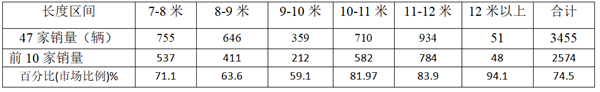 1、 前10家企业在7-8米段的的市场集中度为71.1%,,8-9米段占的集中度达63.6%;9-10米段的市场集中度为59.1%,也是大中型客车长度段中集中度最低的细分市场,说明9-10米段在广西区域竞争最分散,竞争对手也最容易进入,即进入门槛最低。