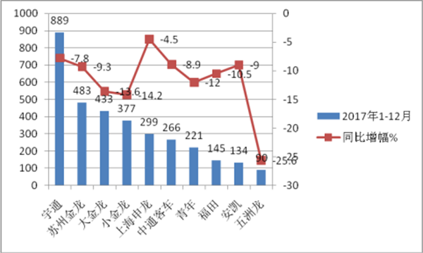 根据上牌数据统计,2017年1-12月广东公路客车销量前10名城市销量与去年同期比统计表: