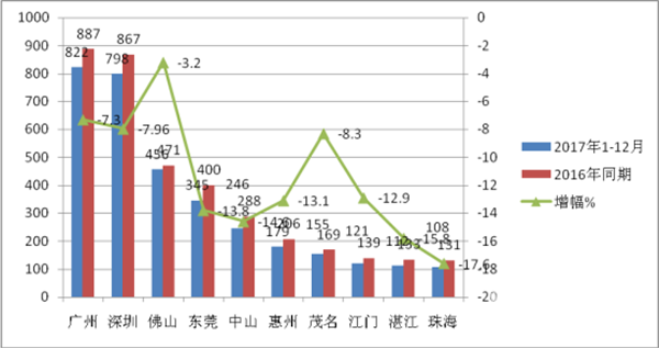 1、 广东区域2017年7米以上公路客车销量前10名区域市场销量同比均下降,降幅最大的是珠海,最小的是佛山。
