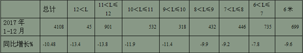 特点三、特大型公路客车销量最小,11-12米公路客车销量最大,降幅也最大;10米以上大型公路客车降幅大于中轻型公路客车