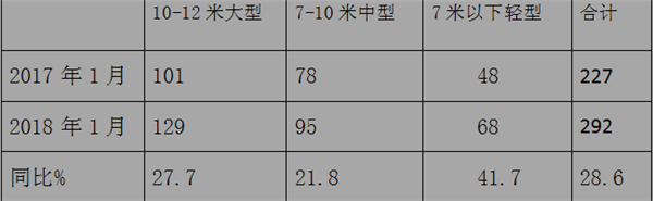 1、按长度车型划分,大、中、轻销量在2018年1月同比均呈现正增长,且幅度均超出20%以上。
