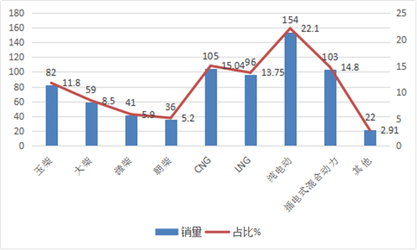五、纯电动权重上升幅度最大,其次是插电式混合动力客车;传统柴油权重均有所下降