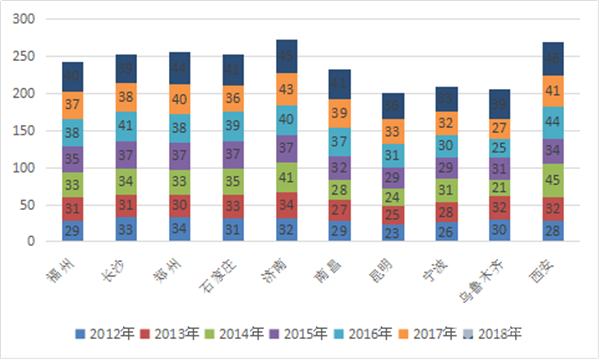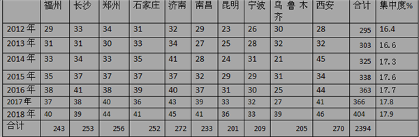 1.销量集中度逐年提高。福州、长沙、郑州、石家庄、济南、南昌、昆明、宁波、乌鲁木齐、西安等十大二线城市近7年1-2月10-11米公交的市场份额总和均在16-18%之间,且逐年在增加。2018年最大为17.9%,2012年最小为16.4%,说明了十大二线城市的10-11米公交采购量每年都介于市场总体需求的五分之一到六分之一之间。
