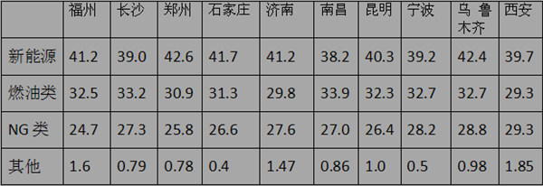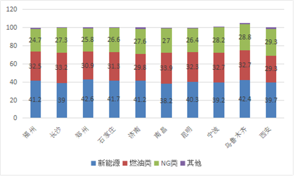 1、十大二线城市中,纯电动公交销量最多,新能源客车占比最大。