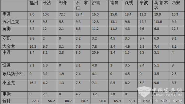 2、主流企业在济南和郑州的10-11米公交市场集中度最高,均达到了90%左右,其次是西安为75.2%和福州72.3%,再次是石家庄也达到68.7%。