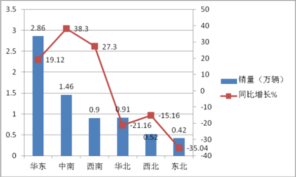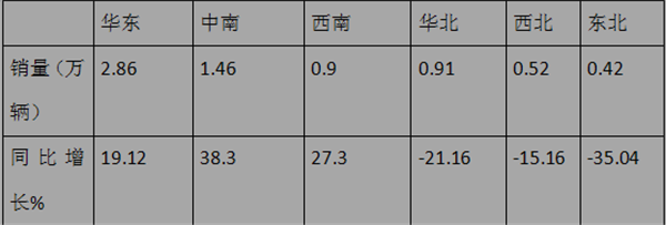 根据中汽协数据统计,2018年1-3月,华东地区销售2.86万辆,同比增长19.12%;中南地区销售1.46万辆,同比增长38.43%;西南地区销售0.90万辆,同比增长27.30%;华北地区销售0.91万辆,同比下降21.16%;西北地区销售0.52万辆,同比下降15.16%;东北地区销售0.42万辆,同比下降35.04%。