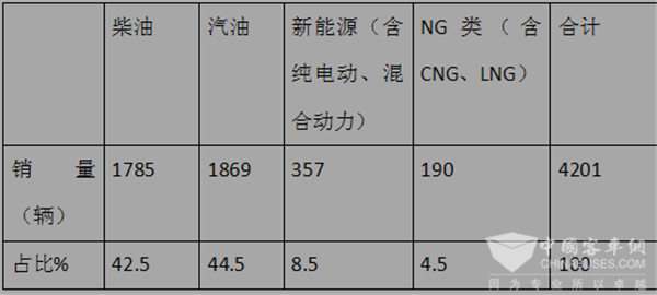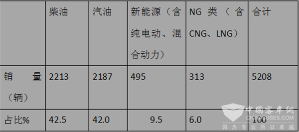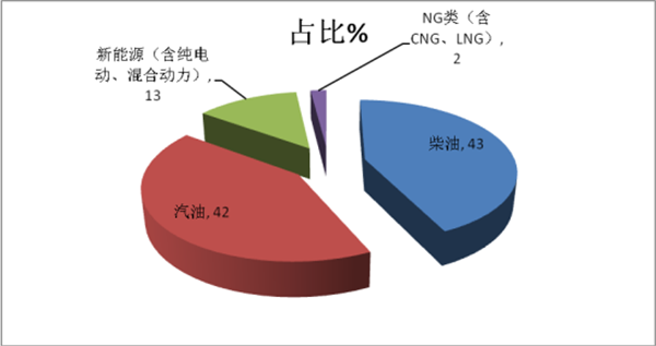 1、按发动机种类划分,华东地区柴油占比最大,东北地区汽油占比最大,中南地区新能源客车占比最大,西南地区NG类占比最大。