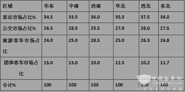 根据最新数据统计,全国6大区域市场按照目标市场划分,2018年一季度其客车销量结构如下: