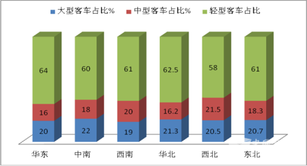 3、 西南区域中型客车市场占比最大,主要是因为西南区域旅游客车中,中型客车市场占比较多所致。