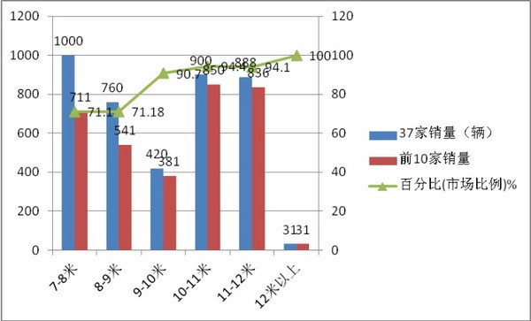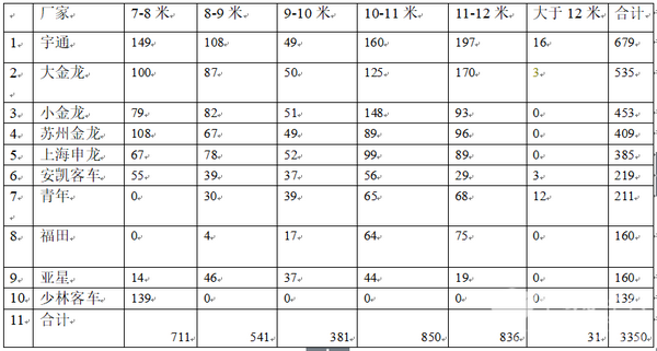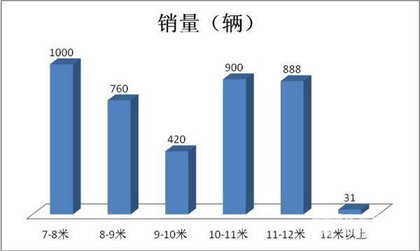 从上表可以看出: 福建市场,7-8米是主打产品,其次是10-11米,再次是11-12米,销量最小的是12米以上的特大型客车,次小的是9-10米,再次是8-9米.
