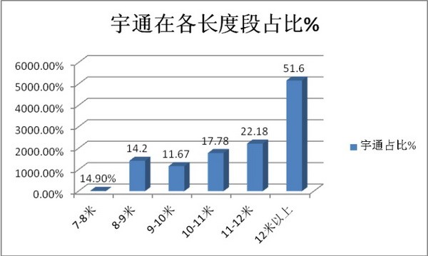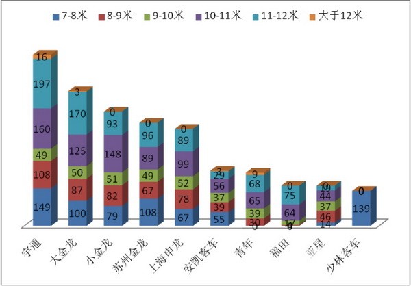 特点三、宇通在除去9-10米外的各长度段销量中,均处于霸主地位从上面统计分析可以看出: