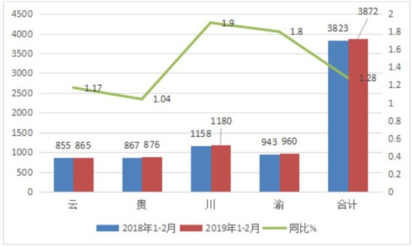 1、近5年1-2月云、贵、川、渝区域座位客车的销量在前4年是没有一定规律,忽高忽低。2019年1-2月销量同比均出现增长,但增长幅度都不大。