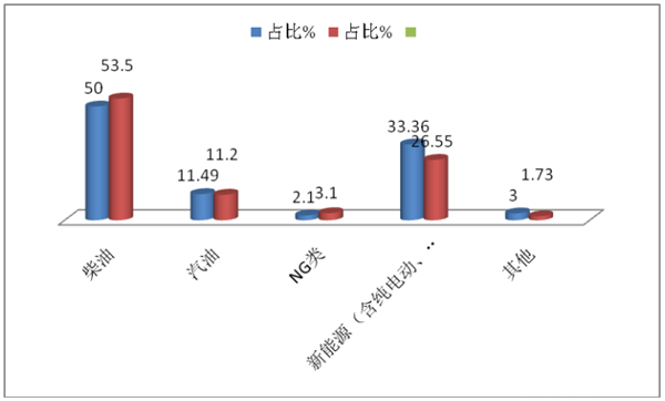 2、新能源客车占据了第二大市场比例,而且同比有上升趋势(同比提高了近6.8个百分点),且上升幅度最大。