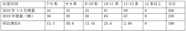 1、云南市场,2019年1-3月10-11米是主打产品,其次是11-12米,再次是8-9米,也就是说大型客车是云南旅游客车市场的主打产品。同比2018年同期,8-9米增幅最大,其次是10-11米段;11-12米同比增幅最小。