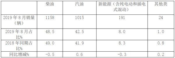 可见,在2019年8月,按动力类型划分,柴油占比达到48.5%,但同比下降0.5个百分点;其次是汽油,占比42.5%,同比增长0.6%。