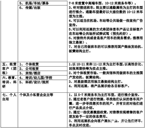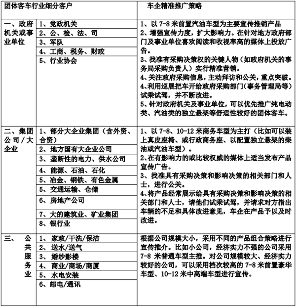 从微观上分析,团体客车各细分市场的具体客户及车企推广策略如下(供车企实战参考):