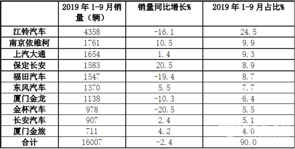 可见,2019年前三季度,广东轻客领域主要需求是客货两用市场,占比6成,但同比下降2.5%,是下降幅度最大的细分市场;其次城市物流市场,同比持平;再次是小客运及短途接驳市场,同比权重增加2.0%,是增加最多的细分市场。