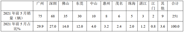 上表数据表明,2021年前5月广东地区公路客车在各区域的分布特点: