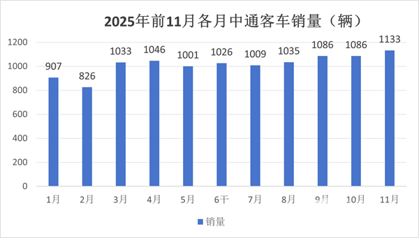 上图可见,2025年11月中通客车销量1133辆,销量居自身2025年1-11月各月第一,也是今年以来中通客车第一个销量超越1100辆的额月份。据分析主要得益于: