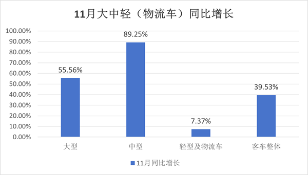 上图表可见,2025年11月中通客车在大、中型及轻客(物流车)各细分市场销量同比均为正增长,可谓“全线飘红”。这种各细分市场全面增长的景象,进一步反映了中通客车在今年11月销量增长是“全方位”的。换言之,中通客车在今年11月正发力各个细分市场,因此成为今年11月中通客车销量的一个突出特点。