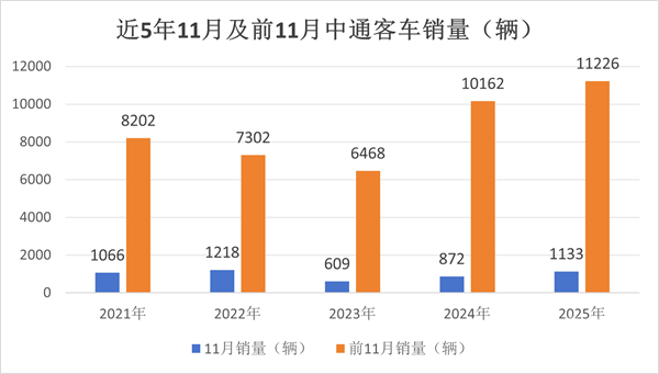 上图可见,2025年11月及1-11月中通客车销量分别为1133辆和11226辆,分别创下近5年同期第二和最高。