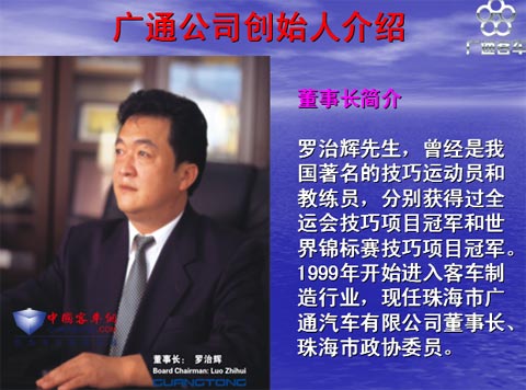 提起广通客车的渊源,就要从广通客车的两位创始人说起,罗治辉董事长体育健将出身,曾夺得11次全国冠军、3次世界亚军,并带领多名运动员获得世界冠军。在告别体坛后,他选择了下海经商,经过多年打拼,成为商海佼佼者。另外一个创始人宣梅女士,她虽出身名门,却特立独行,为婚姻背离父母、为梦想弃医下海,八十年代末从3000元一节服装柜台创业、到连锁服装店、到连锁餐饮业、到国际贸易、再到现在的客车制造业,一一彰显其天赋,她行行领先、剑走偏锋、演绎致富神话,建立了自已事业王国。致富不忘付出,罗治辉在1999年8月收购韶关客车厂,2002年整体搬迁珠海,并将奥运“五环” 精神延承到广通客车 (五个银色的等圆首尾相连环绕在圆周上组成了广通客车“五环”标志),它蕴意着: