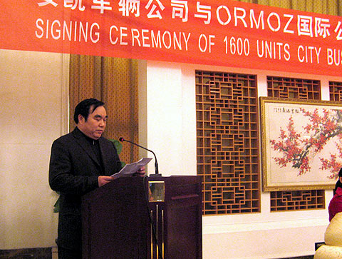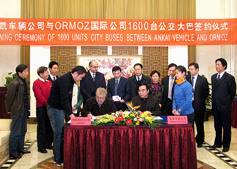 元月7日下午,安凯车辆制造有限公司与伊朗ORMOZ国际贸易公司达成出口1600台城市客车的协议,并在合肥明珠大酒店顺利举行了签约仪式。安凯车辆公司总裁张宽发与伊朗ORMOZ国际贸易公司董事长D.J先生分别代表双方签署协议,协议就安凯车辆公司向伊朗出口1600台12米公交大巴以及指定ORMOZ国际贸易公司作为安凯车辆公司在伊朗代理销售协议单位事宜达成一致。