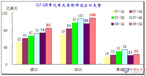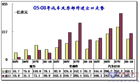 2008年上半年,全国汽车及零部件累计进出口总值达到363亿美元,其中进口总值159亿美元,增长45.9亿美元,增幅40.5%;出口总值203.7亿美元,增长49.6亿美元,增幅32.2%;净出口达44.5亿美元,增长3.7亿美元,增幅9.15%。