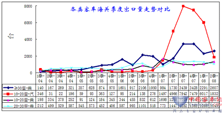 随着大环境的变化,汽车商品进出口走势出现逆转,进口较07年下半年增长20.4亿美元,而出口较07年下半年下降0.4亿美元,由此导致进出口的顺差减小20.7亿美元。