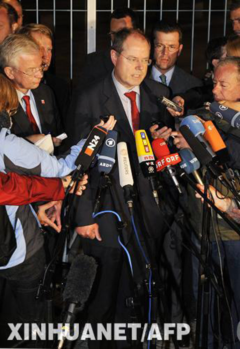 5月30日,德财政部长施泰因布吕克(中)在柏林参加关于欧宝并购案的会议后接受媒体采访。施泰因布吕克30日说,有关加拿大汽车配件厂商麦格纳收购欧宝汽车公司的协议已经达成。新华社/法新