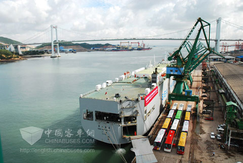 8月12日,大金龙厂区,25辆18米BRT公交客车整装待发,等待装船交付海外客户。随着该批车辆交付,大金龙2009年出口量超过1300辆,出口业绩行业领先。
