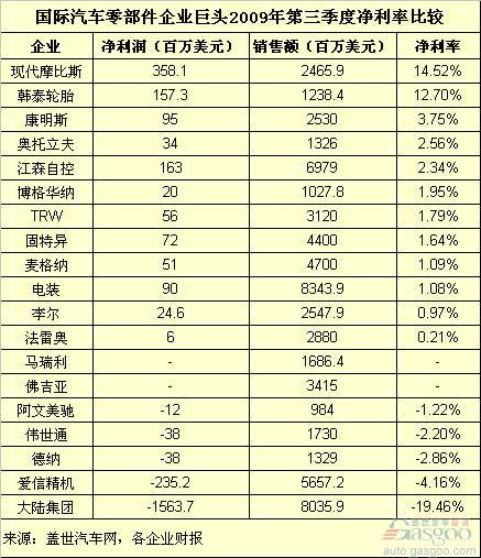 注:1. 此处的第三季度指2009年7-9月,虽然这是表中不同企业的第三财季或第二财季或第四财季。这里我们暂统称为第三季度。此处的净利润和销售额均已换算为美元。换算标准是:欧元对美元——1:1.5057;日元对美元——1:0.0116323,韩元对美元——1:0.000860081。