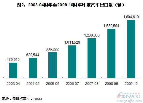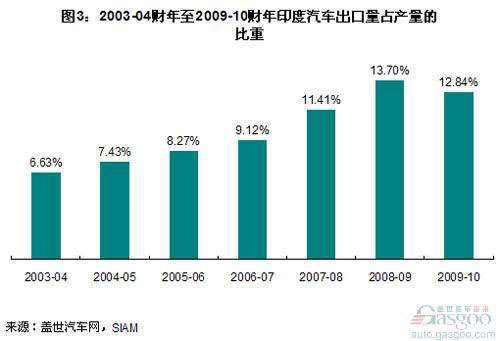 印度汽车出口量占其总产量的比重已由2003-04财年的6.63%逐渐升至2009-10财年的12.84%。
