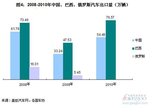 金砖四国中,只有俄罗斯的汽车出口量低于中国。从2007-2009年,该国汽车出口量持续下滑,分别为17.76万辆、16.01万辆和5.45万辆,其在该国总产量中的比重也由10.66%降至8.93%,并在2009年进一步降至7.54%,但仍高于同期中国出口量在产量中的占比。