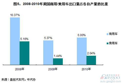 2010年,商用车出口量占其总产量的比重为6.00%,略高于2009年的水平(5.37%),而比2008年降了约4个百分点。