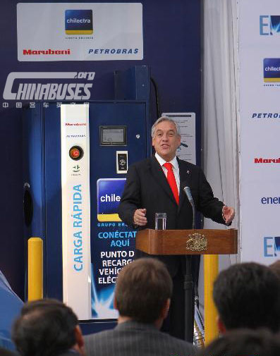 中国客车英文网【www.chinabuses.org】:4月20日,在智利首都圣地亚哥,智利总统皮涅拉(左三)出席拉美首个电力汽车快速充电站启动仪式。拉美首个电力汽车快速充电站当天在智利投入使用。据介绍,这个全电动轿车充电终端从法国进口,工作功率为50千瓦,直接并入智利电力公司电网,电力轿车只需半个小时就可以完成80%充电,其后自主续航能力能达到130公里,如果电池完全充满,续航能力将达到200公里。