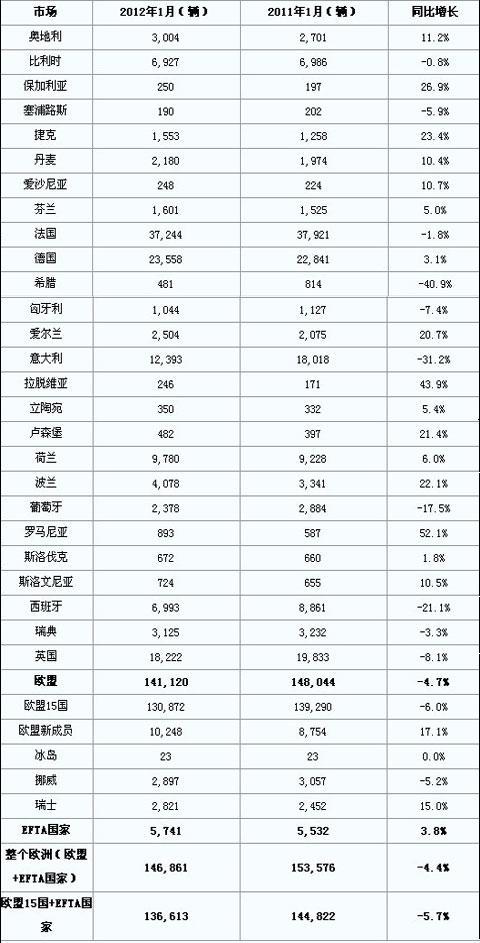 2012年1月欧洲商用车注册量(分市场)