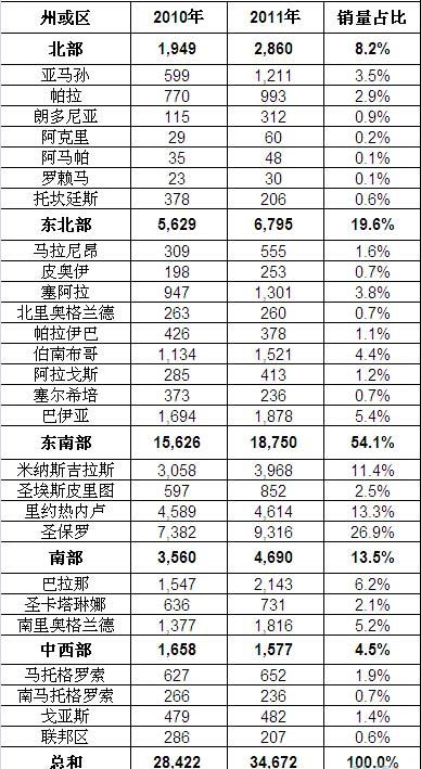 巴西各州近两年客车新车注册量