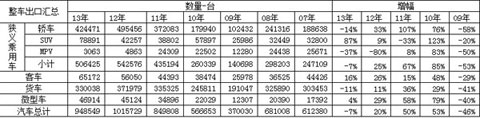 2012年全年的整车出口(含底盘)出口101万台,增速落到20%的低位;13年的全年出口95万台,增速下降到-7%。今年出口表现较好的是SUV、客车出口和微型车出口,尤其是SUV出口增长达到87%。但传统的卡车出口-11%的表现较差,且连续几年的卡车出口都是低增长和负增长,这也说明我们最有优势的资源类卡车出口遭遇瓶颈。