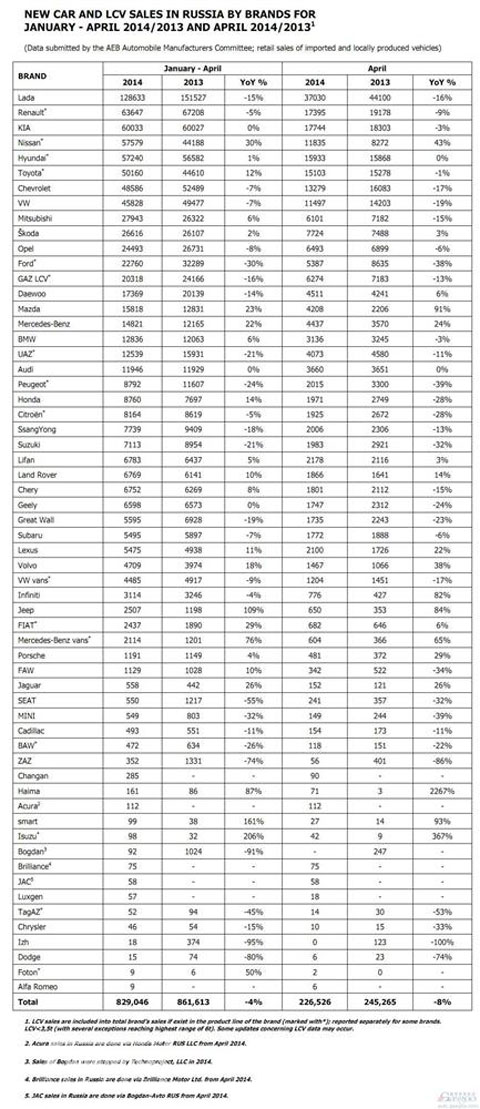 2014年4月份,俄罗斯市场轻型车(含乘用车和轻型商用车)新车销量为226,526辆,较之2013年4月份的245,265辆,同比下跌7.6%。自从去年12月终止9个月同比下跌以来,俄罗斯车市迄今已经连续同比滑坡4个月。