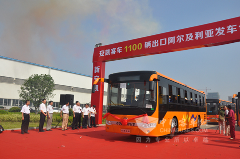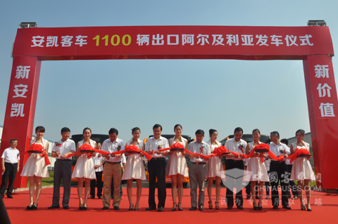 中国客车英文网[www.chinabuses.org]: 2014年7月22日,“安凯客车1100辆出口阿尔及利亚发车仪式”在合肥安凯客车隆重举行。安凯客车向阿尔及利亚交付的1100辆公交客车在当日发车起运。安徽省商务厅、安徽省国资委的有关领导,江汽集团董事长安进、安凯客车董事长戴茂方、安凯客车总经理童永等领导参加了本次活动。