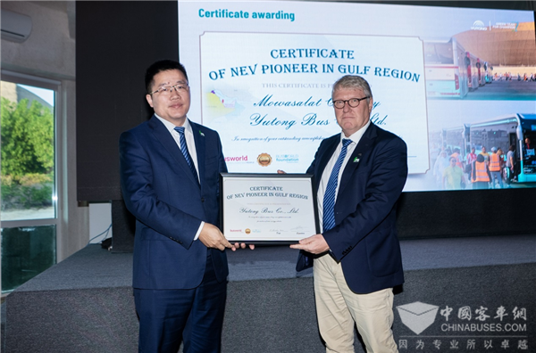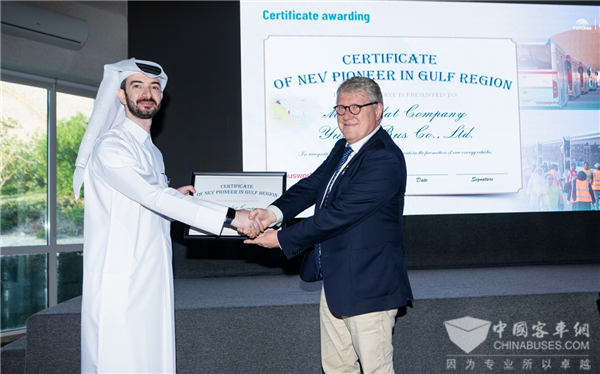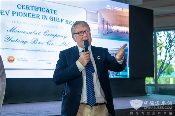 本次论坛加强了全球绿色低碳合作与交流,共筑区域协同发展的新生态。Busworld学术委员会主席JAN RICHARD K DEMAN,对宇通Mowasalat在卡塔尔公共交通电动化过程中的卓越贡献给予了高度赞扬,引领了波斯湾及中东地区的电动化进程。特代表Busworld表彰宇通客车、Mowasalat为 “海湾地区新能源绿色先锋”。