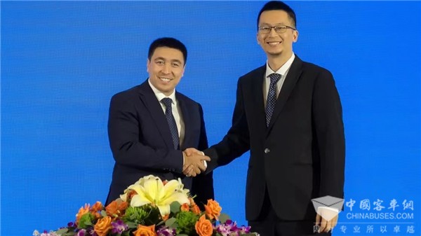 (HTA总经理Adilbek Gayev(左)与金旅海外销售公司总经理安敏(右)签订战略合作协议)