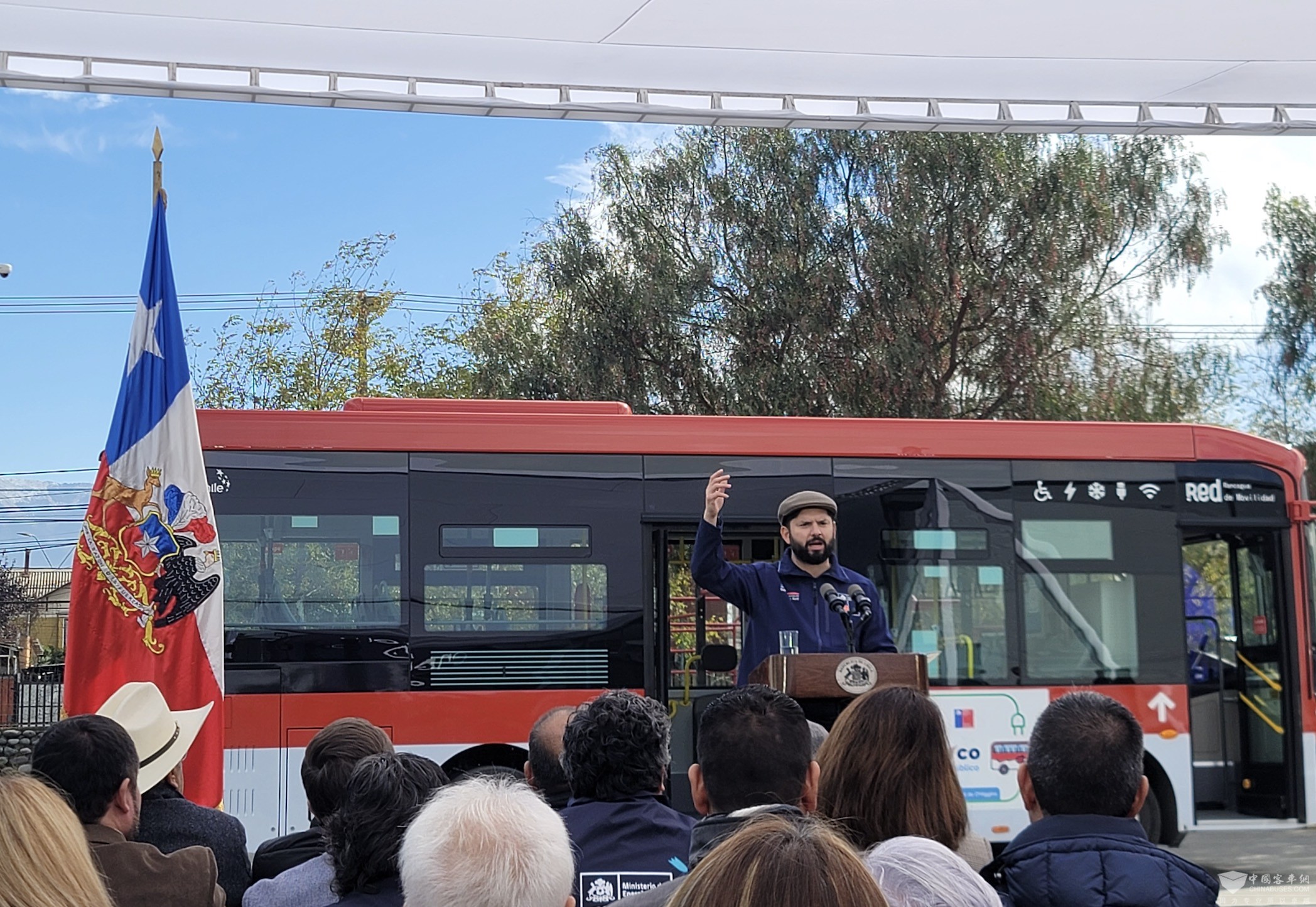 智利时间2024年5月9日,中通客车公司纯电动车批量交付仪式在智利奥希金省兰卡瓜市成功举行。智利总统加夫列尔· 博里奇、智利交通部长胡安·卡洛斯·穆尼奥斯、智利奥希金州长帕布罗·席尔瓦·阿玛雅出席仪式并讲话。