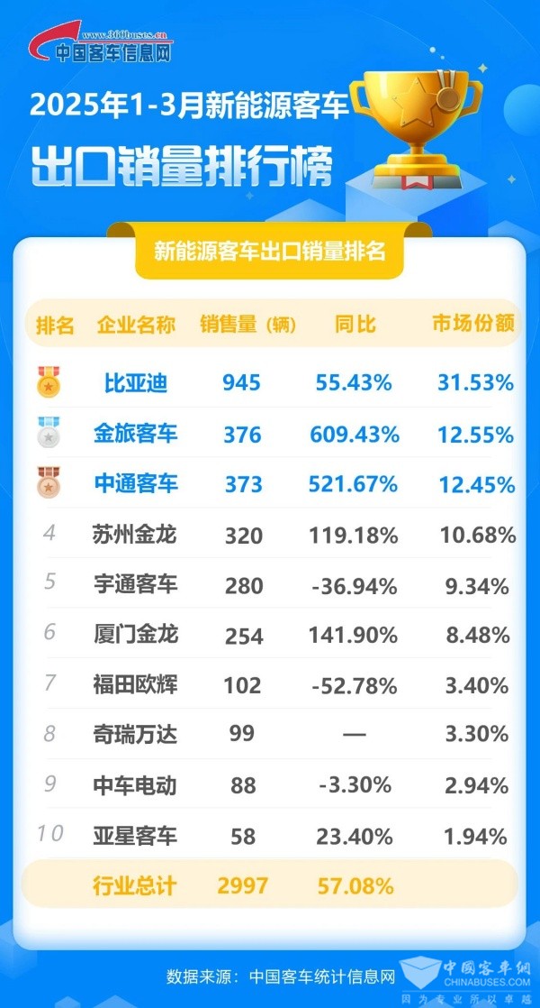 2025年1-3月份,中国新能源客车累计出口2997辆。其中,比亚迪以945辆的新能源客车出口量位居榜首,同比增长55.43%,市场份额达31.53%,以绝对优势领先行业。