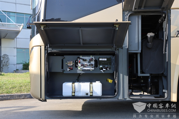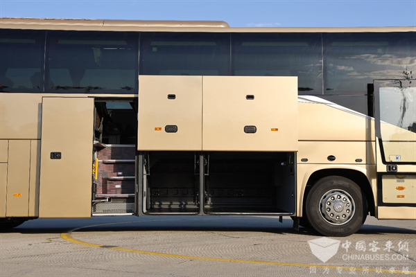 这款V12豪华客车的行李舱使用率较高,采用平行上开门的设计,足足有10m³,相比同类竞品行李空间多2-3m³。